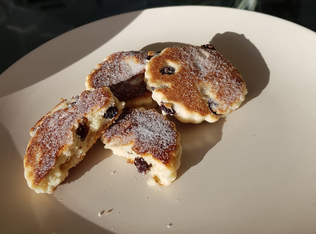 Grease the bakestone with a little butter and wipe off any excess with a piece of kitchen roll (you can then use to re-grease between each batch). Cook the Welsh cakes in batches for about three minutes on each side or until they’re just cooked through without burning. They should be slightly springy to the touch.