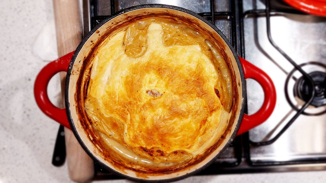 Remove the pan from the heat and carefully place the pastry lid on top, roughly tucking in the sides and making a slit in the top to let the steam out. Brush with milk and bake in the oven for 25 minutes.