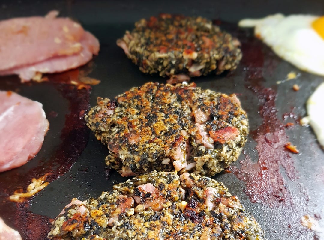When everything is ready, place a laverbread cake on a plate, followed by the bacon rasher, then the mushroom and finally, top with the egg. Sprinkle with a little black pepper or chilli flakes or a good splodge of ketchup or brown sauce.